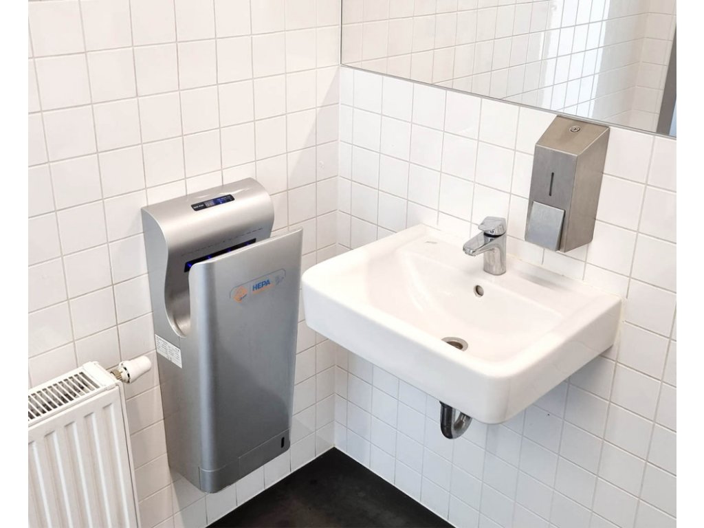 V roce 2014 jsme uvedli na trh duální tryskový vysoušeč rukou Jet Dryer Style s Hepa filtrem a sterilizačními UV diodami. Revoluce v hygieně vysoušení rukou je zde! Pokud vyžadujete hygienické prostředí a čistotu na vašich toaletách, nalezli jste ten správný vysoušeč. Certifikovaný HEPA filtr slouží k zachytávání i těch nejmenších prachových částic. Tři UV LED diody, které osvětlují prostor HEPA filtru se starají o neustálou sterilizaci HEPA filtru a na něm zachycených prachových částic spolu s roztoči, viry, spory, plísní, mikroorganismy atd. Tento systém zabezpečuje maximální čistotu a dezinfekci vyfukovaného vzduchu