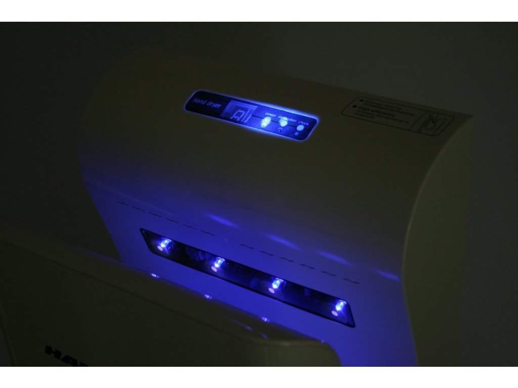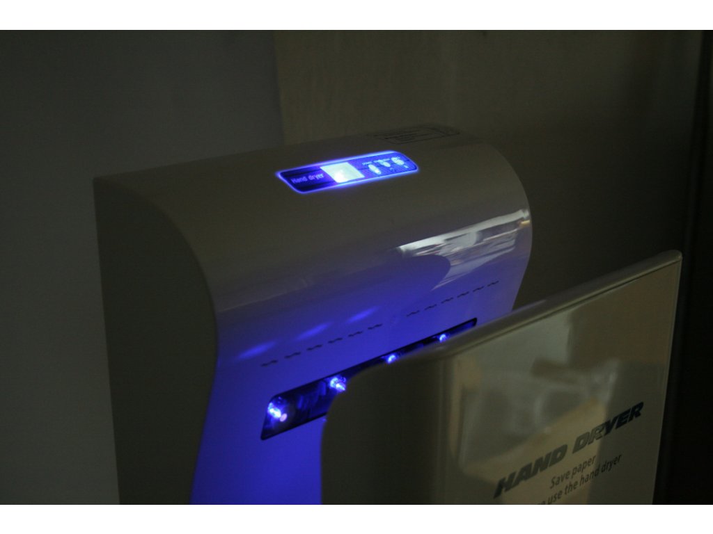 Moderní design s modrým LED světlem, které vybízí k vysušení rukou